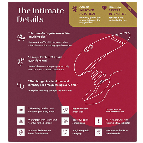 | 人気のウーマナイザーから待望の商品がリリース!「ウーマナイザー プレミアム2 (ボルドー)」。 その名に恥じないプレミアムな機能を搭載♪ボタンを押さなくてもお肌に当てるだけで吸引が自動でスタートし、離すだけで振動が止まるタッチセンサー機能を搭載。 この機能はカップルさんで使うときにも本当に大活躍します♪さらにパイロットモードを搭載し、ボタン操作をしなくてもWomanizer自身が吸引の強弱を自動でコントロールしてくれます。 これにより予測できないゾクゾクとした楽しみが味わえます♪振動レベルは弱・中・強の3段階!ゆったりとラグジュアリーな時間を過ごすのに最適です♪素材はシリコン/ABS樹脂で2時間のフル充電により連続4時間での使用が可能です。 ※製造時期によりパッケージが異なる場合がございます。 ※こちらの商品は受注発注商品の為、ご注文から発送までに3、4営業日掛かる場合が御座います。 |