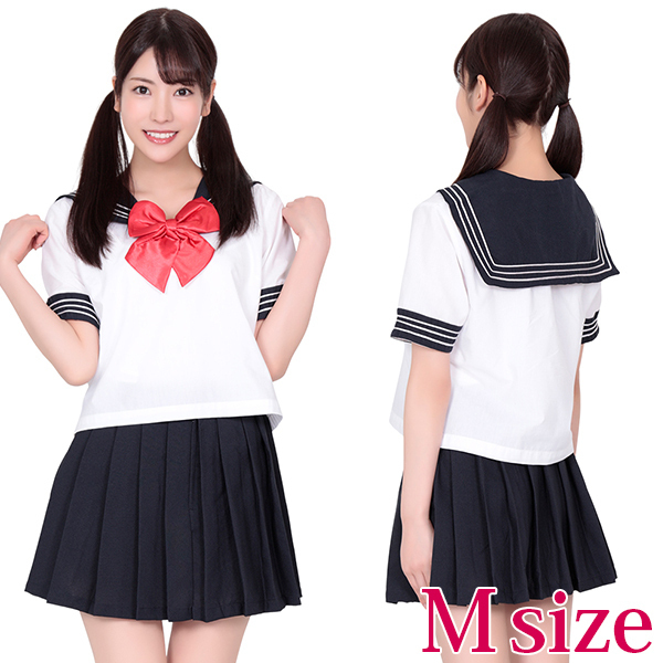 | 大きな赤色のリボンが、とてもよく目立つセーラー服。 リボン付ブラウスとミニプリーツスカートのセットです。 紺、白、赤の、制服定番カラーで、使いやすいコスチュームです!赤いリボンが私の目印! ※L・LLサイズ(b09281)(b06309)あります。 靴下は別売 |