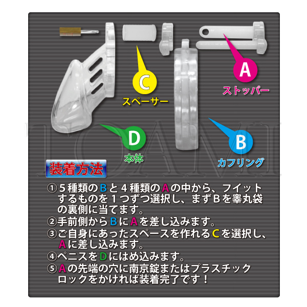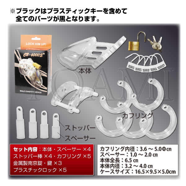 | さらに拘束感を味わいたい方に!人気のプラスティック貞操帯「CB-6000」にショートバージョンが登場!「CB-6000」よりも局部の全長が約2cm短くなり、さらに強い拘束感を味わえるようになりました。 大きさの異なるカフリングとピンが付属していますので、フィット感の調節も可能です!また装着したまま排泄もできるので、装着後に付属の南京錠、またはプラスティックロックで鍵をかければ、日常的に拘束&勃起制限を行えます。 こちらはSMボンテージ風のブラックカラー。 |