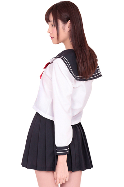 | 長袖ブラウスに定番の白×紺ラインがデザインされた、清楚感溢れるセーラー服コスチューム。 少しミニ丈なプリーツスカートは、清楚だけどどこかセクシー!紺×白に赤いリボンがマッチし、王道だけど可愛らしいセーラー服に仕上がっています。 |