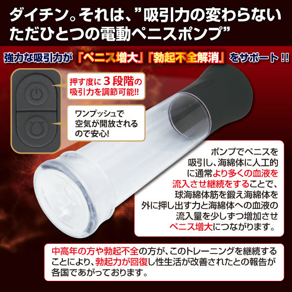 | 「ペニスを増大したい」「勃起不全を解消したい」といった男性のお悩みもこれで解決!お悩みを解決しながら快感も得られる、まさに一石二鳥の電動ペニス増大ポンプ「dytin ダイチン」です。 本体に付いた2つのボタンスイッチのうち、上のボタンを押すことで吸引開始!ボタンを押す度に3パターンの吸引力がお楽しみいただけます!使用を止めたい時は、下のボタンをワンプッシュするだけで空気抜きができます。 個人差はありますが、日々トレーニングすることで見る見るうちに逞しさが戻ってくる!幅広い年齢に人気のある男性補助グッズです。 |