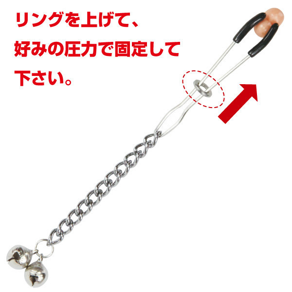| 体で、目で、耳で感じる大人の遊び!クリトリスに装着して快感を楽しむボディクリップ。 先端にラバーコーティングを施して、ズレることなくクリトリスを挟み込める&敏感部分を痛めないソフト設計。 リングで圧加減を調節すれば装着完了!快感に身をよじらすたびに、チェーンで繋がれた鈴がチリンチリンと軽やかに音色を奏でるボディクリップです。 |