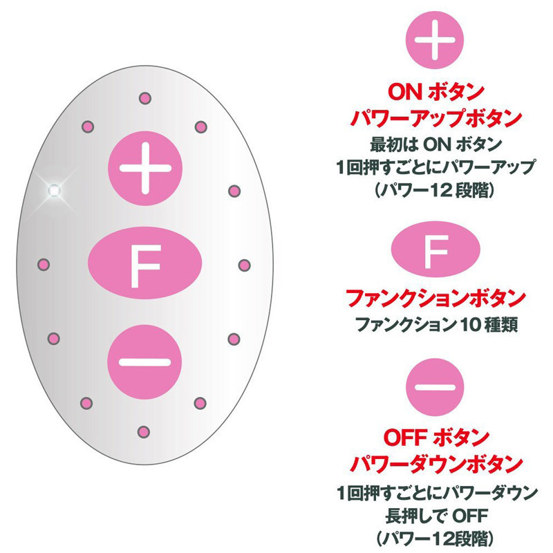 | 知ってるアレとは少し違う?多彩な振動がウリの優秀シングルローター。 ●スタンダードなエッグ型タイプ●握りやすいスティックリモコン●12種強弱×10種リズム→120種振動●+…電源ON・パワーUP●-…電源OFF(長押し)・パワーDOWN●F…10種パターン切り替え●静音設計&生活防水仕様。 もう普通のローターには戻れないかも!小さな体に多彩なアクションをぎっしり詰め込んだピンクローター。 「BIG」という名前ですが大きさは定番のシングルサイズです。 |