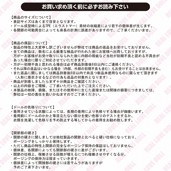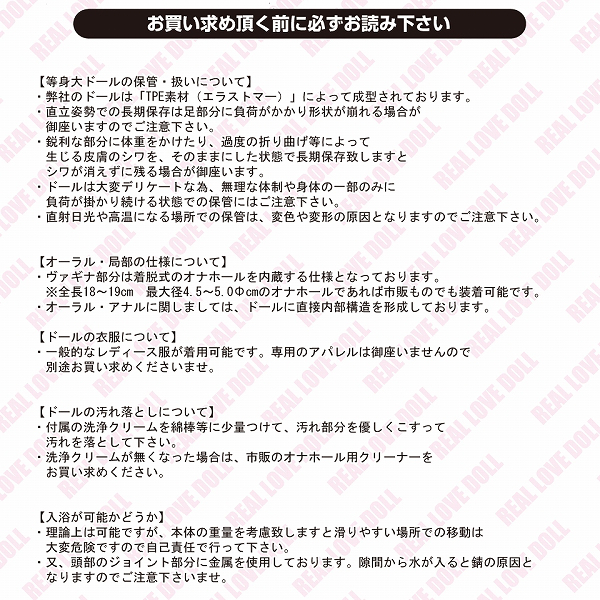 パッケージ:30.0×151.0×43.0cm 身長:153cm 体重:約32kg スリーサイズ:B78cm・W56cm・H82cm |