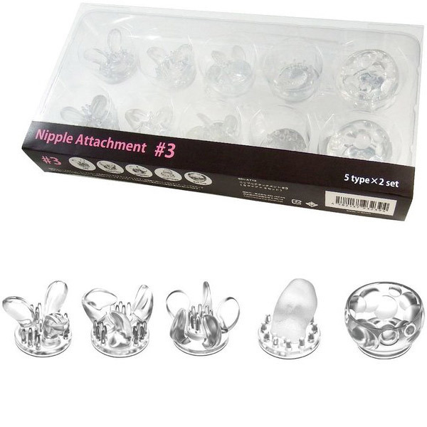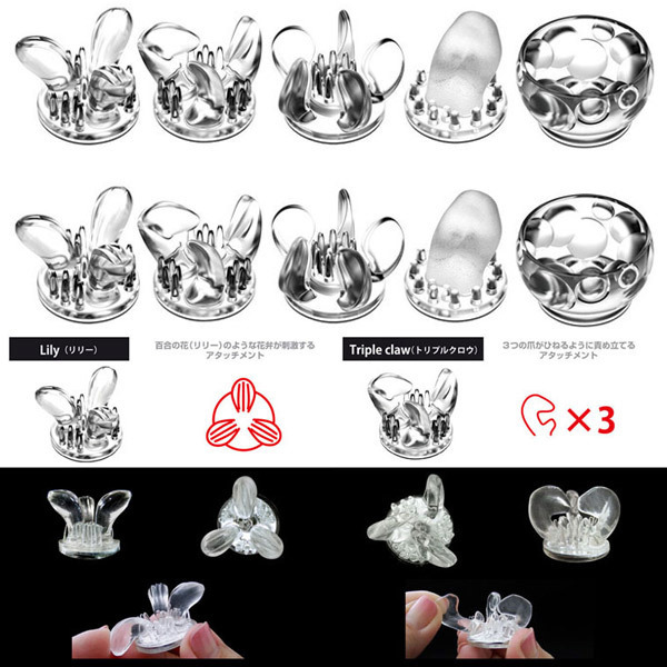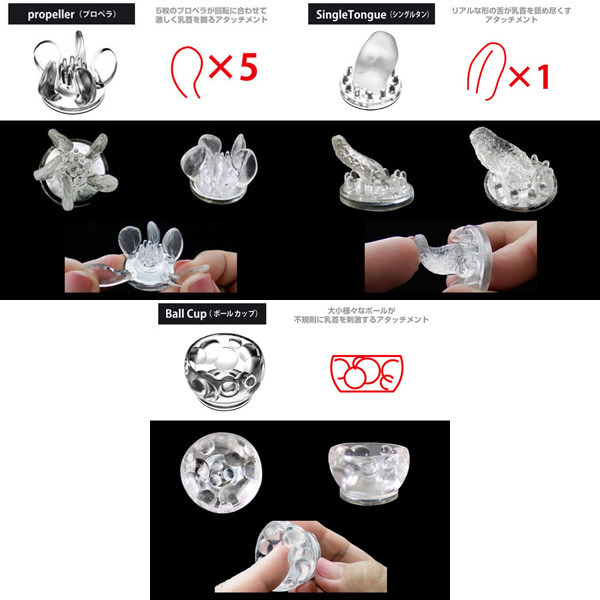| 吸引&振動で責めるチクニーマシーン「ニップルドーム」専用の付け替え用アタッチメント。 ●お肌に優しいソフト弾力素材●本体付属と同形状の5種×各2個●リリー:百合の花びら風●トリプルクロー:3つのツメ型●プロペラ:中央ブラシ+5枚ヒダ●シングルタン:リアルなザラザラ舌●ボールカップ:大小ボール●簡単着脱のマグネット式。 ニップルドーム付属のアタッチメントが破損や劣化、紛失で使えなくなってしまった…そんな方に朗報!計5種の多彩な刺激を楽しめるスペア用アタッチメントが登場しました。 左右で別々のアタッチメントを装着して異なる刺激を楽しんだりと遊び方も多種多様です。 こちらの「#3」セットは、ニップルドーム本体のブラック(b23838)、ホワイト(b23826)に付属しているアタッチメントと同形状です。 |