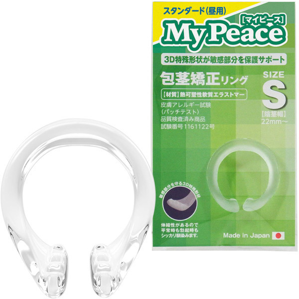 | 誰にもバレずに矯正可能!悩める包茎さんの為の矯正リング。 ●フィット力の高いエラストマー製●裏筋に当たらない絶妙C型リング●日常使用にお勧めのスタンダード●平常時・勃起時いつでも装着可能●両端の特殊な3D凹凸でズレを防ぐ●皮膚アレルギー試験クリアで安心●SMLの3サイズ中、Sサイズタイプ。 【使用方法】包皮を剥いて亀頭を露出→リングの開きを裏筋側にして装着→リングが皮戻りを防いで矯正。 伸縮性に優れた包茎矯正リング「マイピース」は、この他にM(b25061)とL(b25062)、ソフト夜用のS(b25057)とM(b25058)とL(b25059)の計6種類を展開。 普段はスタンダード昼用、寝る時はソフト夜用、と使い分けるのもおすすめです。 |