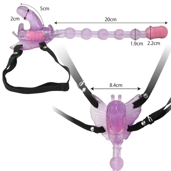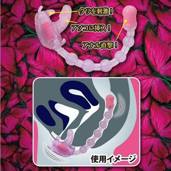 | ガッシリ固定で3点同時責め!ベルト固定式のバタフライ型ローター「バタフライエフェクト」。 ●挿入したままベルトで固定可能●裏側の小突起でクリトリス責め●ペニス型の突起でヴァギナ責め●20cmのロングビーズでアナル責め●柔らかで丈夫なエラストマー素材●ヴァギナとアナル側に強力モーター●7種類の振動パターンを搭載。 前も後ろも強力悶絶刺激!奥深くまで響く快感振動のベルト装着型ローター。 バタフライのディルド部とアナルビーズ先端にダブルモーターを搭載!ゴム製ベルトでしっかりと固定できるので、装着したまま外出すれば屋外プレイもお楽しみ頂けます。 |