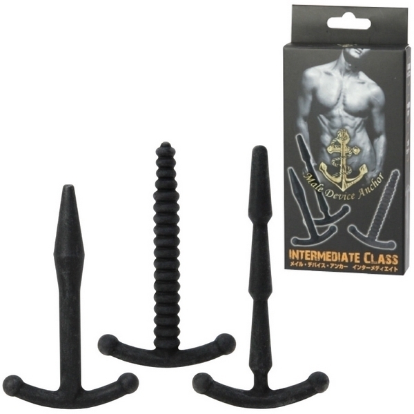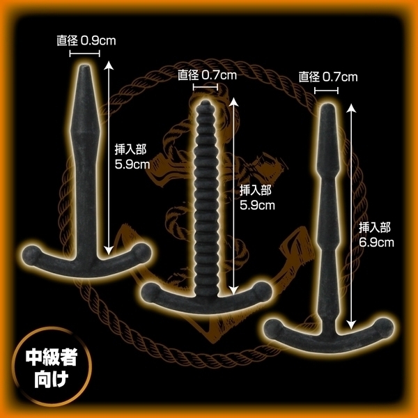 | CBT中級者さんの尿道責めプレイに♪錨デザインの尿道プラグ3個セット「メイルデバイスアンカー インターメディエイト」。 ●マニア向けの尿道プラグ×3個セット●柔軟性のある高品質シリコンを採用●長さのある中級者向けのミドルサイズ●タイプ1:挿入部長5.9cm×直径0.9cm●挿入しやすい矢尻型のヘッド形状●タイプ2:挿入部長5.9cm×直径0.7cm●最初から最後まで続く凸凹リブ形状●タイプ3:挿入部長6.9cm×直径0.7cm●引き抜き時が刺激的な3連の円錐形状。 究極の快感テクニック、尿道責めで新たな快楽を!フェティッシュなCBTプレイ用のSMグッズ。 刺激の高さと負担の少なさを両立させた程良い長さの「インターメディエイト」タイプは、尿道責めプレイ中級者さんの拡張用にも最適です。 |