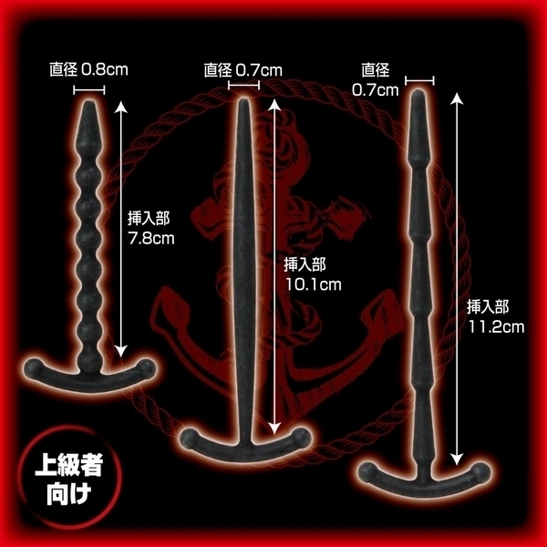 | CBT上級者さんの尿道責めプレイに♪錨デザインの尿道プラグ3個セット「メイルデバイスアンカー アドバンス」。 ●マニア向けの尿道プラグ×3個セット●柔軟性のある高品質シリコンを採用●奥まで届く上級者向けのロングサイズ●タイプ1:挿入部長7.8cm×直径0.8cm●先端から根元まで続く7連ボール形状●タイプ2:挿入部長10.1cm×直径0.7cm●中腹部が緩やかに膨らんだカーブ形状●タイプ3:挿入部長11.2cm×直径0.7cm●引き抜き時が刺激的な5連の円錐形状。 究極の快感テクニック、尿道責めで新たな快楽を!フェティッシュなCBTプレイ用のSMグッズ。 刺激の高さと負担の少なさを両立させたロングボディの「アドバンス」タイプは、奥深くまで刺激が欲しい上級者さんに最適です。 |