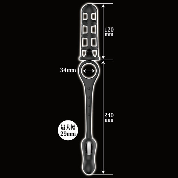 パッケージ:26.0×15.0×5.0cm 本体:サック全長12.0cm リング内径3.4cm アナルプラグ全長24.0cm USB充電式 |