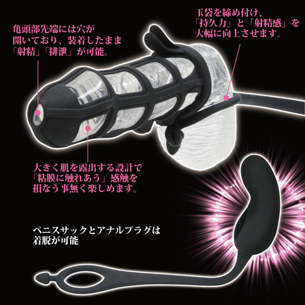 | 想像をはるかに超える未体験の絶頂感!メッシュ状ペニスサック+電動アナルプラグが合体した「PAアシストギア バイブレーター」。 持久力サポートと前立腺刺激で射精感を大幅UP!高品質シリコン素材を採用したペニスサックは、挿入感を損なわないメッシュ形状!また、亀頭先端部に穴が開いているので装着したまま射精&排泄が可能です。 さらに、玉袋を締め付けるリングで射精もコントロールしてくれます。 アナルプラグは7パターンの振動機能を備えた電動タイプ!約90分の充電で約65分連続稼働するUSB充電式(USB充電コード付属)です。 サックとプラグは着脱出来るので単体でも楽しめます。 |