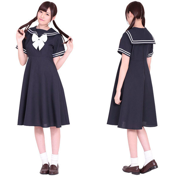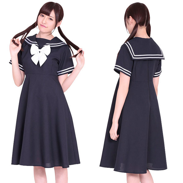 | 長めのワンピースでお嬢様風に♪紺×白カラーのセーラー服コスプレ。 セーラー服では珍しいワンピースタイプ!ハイウエストデザインなのですっきりとした清楚な印象に♪可愛らしい白リボンをアクセントにしたスクール制服コスチュームです。 ※セット内容以外は付属しておりません。 |