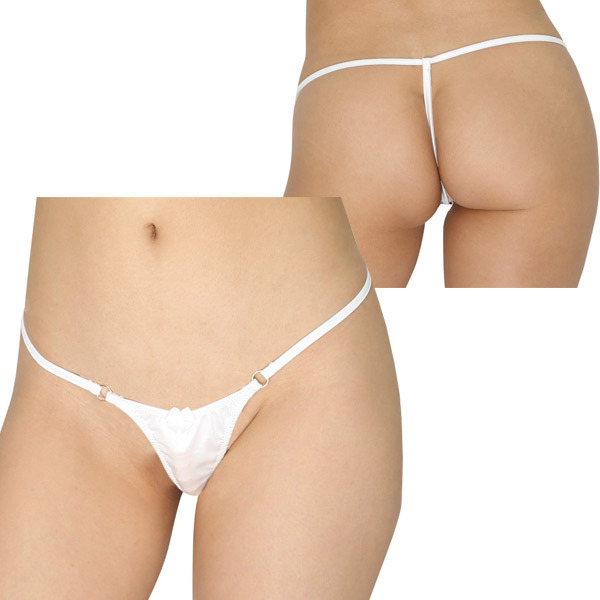 | 内側に秘密の6連ビーズ付き♪ミニマムな極小フロントがセクシーなホワイトカラーのTバックショーツ。 光沢フェリカ生地のフロントはギリギリまで攻めたミニマムサイズ!両サイドとバックは華奢なストリング仕上げ。 さらに、内側のセンター部分にキラキラゴールドの大玉ビーズを6個並べた大人のランジェリー!一般的なパールショーツに付いているような丸ビーズではなく、凸凹フォルムの多面体なのでより刺激的に楽しめます。 |