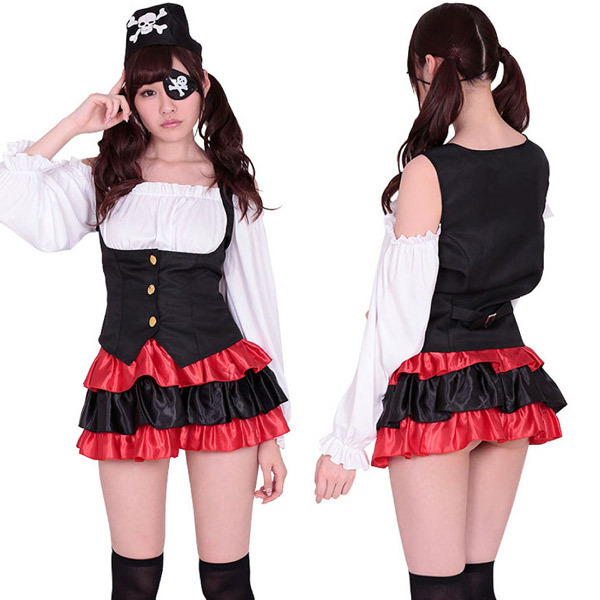 | 眼帯コスプレ好きは注目!キュートなパイレーツガールに変身♪ハロウィン仮装にピッタリな海賊コスチューム。 オフショルダーブラウス付きのベストと、黒×赤カラーの光沢ティアードフリルスカートのセット!眼帯&スカーフ帽の小物も付属した充実セットのパイレーツ衣装です。 眼帯付きのコスプレをするならせひどうぞ! |