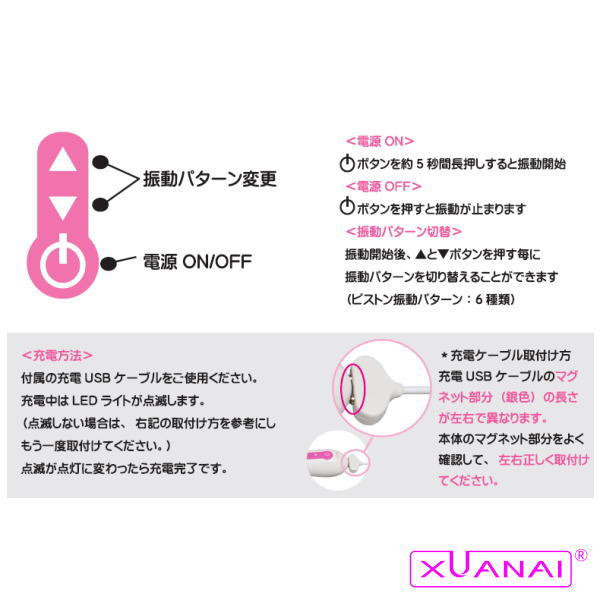 | ズンズン突き上げる超快感!振動+回転+ピストン機能を搭載した『xuanai(シェンアイ)』ブランドのローリングピストンバイブ「XUANAI VATERO」。 シリコン製ボディの先端部分に内蔵されているパールがグルグル回転刺激しながら、上下に激しく動く最大幅1cmのピストン機能で奥までズンズン突き上げます。 さらに、クリバイブにもパワフルモーターを内蔵!ローリング&ピストンは3パターン、振動は12パターンからお好みで選択可能です。 約2.5時間のフル充電で最大45分稼動するUSB充電式バイブのxuanai!ワンタッチ着脱のマグネット式充電ケーブルも付属しています。 |
