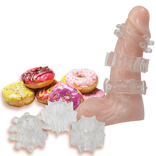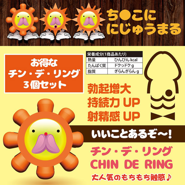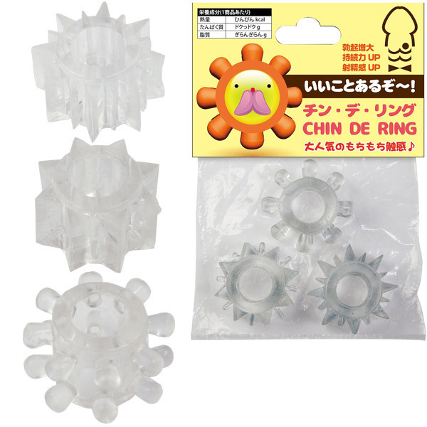 | 複数同時に装着すれば更に強力サポート!お得なペニスリング3個セット「チン・デ・リング」。 勃起増大や持続力UP、射精感UPに!柔らかくモチモチ感触の丈夫なエラストマー素材を採用した男性用補助グッズ。 それぞれ形状が異なる刺激的な突起がついているので、単品使いから複数同時使いまでマルチに楽しめる3個セットです。 |
