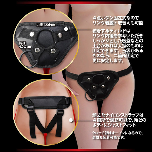 | お気に入りのディルドをしっかり固定&装着できるストラップオンハーネス「ラヴァーズ デラックスストラップオンハーネス」。 4点ボタン固定式なのでリングの着脱&取替えも可能!各リング内径4.5cm以内であれば、吸盤などのしっかりとした土台があるディルドなら大抵のものは固定可能!玉袋があるディルドなら2ヶ所固定で更に安定します。 頑丈なナイロンストラップのベルトは4ヶ所で調節可能!クロッチ部分はオープンになるので男女問わずお使いいただけます。 ※ディルドは付属しておりません。 |