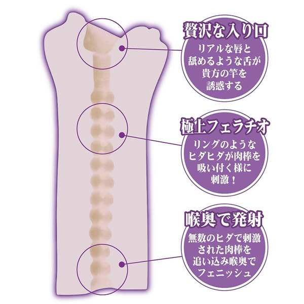 | イイオンナ、ゆかりの舌使いと口内の粘膜で絶頂!ヒダヒダの喉で感じる至極のフェラオナホール「イイオンナ、ヤリ放題 宮沢ゆかり」。 入り口からリアルな唇と舐めるような舌がアナタの竿を誘惑!続いてリングのようなヒダヒダが肉棒に吸い付くように刺激します。 さらに奥へと肉棒を吸い込み、最後は喉奥でフィニッシュ。 全身でイキまくるゆかりちゃんの清純ボディを堪能できる貫通型フェラチオオナホールです。 |