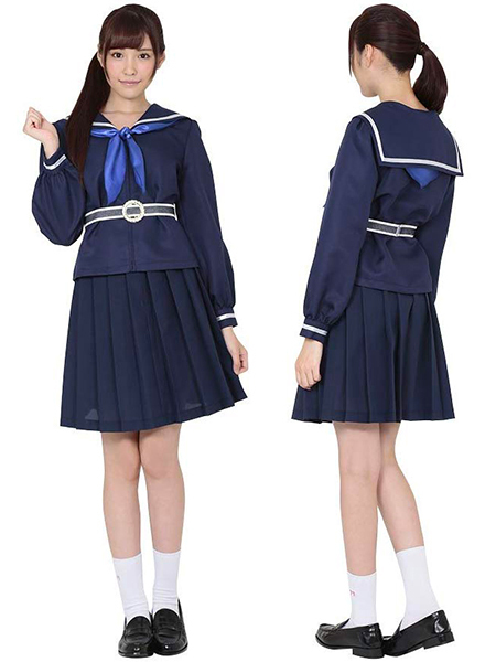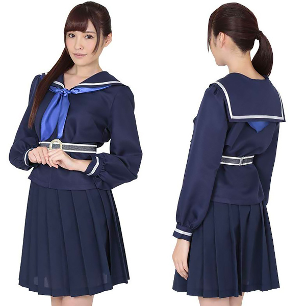 | セーラー服にちょっぴりアレンジを加えたキュートな制服コスチューム。 ネイビーカラーの制服は襟や袖口にラインがあしらわれ、膝上丈のプリーツスカートが可愛らしいコスプレ衣装です。 爽やかなブルーカラーのリボンとウエスト部分のベルトが個性的なので、ありきたりなセーラー服に物足りなさを感じている方にもオススメ。 |