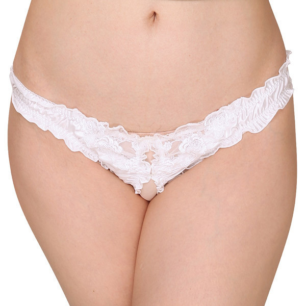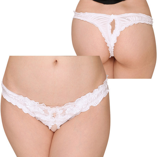 | フロントにフラワーレースをあしらったエレガントなデザインショーツで、光沢感が華やかに魅せてくれています♪ホワイトカラーで清純そうに感じられますが、実は結構大胆な作りとなっていて、よく見てみるとクロッチ部分がオープンになっているというエロティック仕様。 後ろはTバックスタイルとなっているから、お尻もしっかりアピールできるようになっています♪ナイトプレイに用いれば、その見た目のギャップにパートナーの性欲も掻き立てられることでしょう。 |
