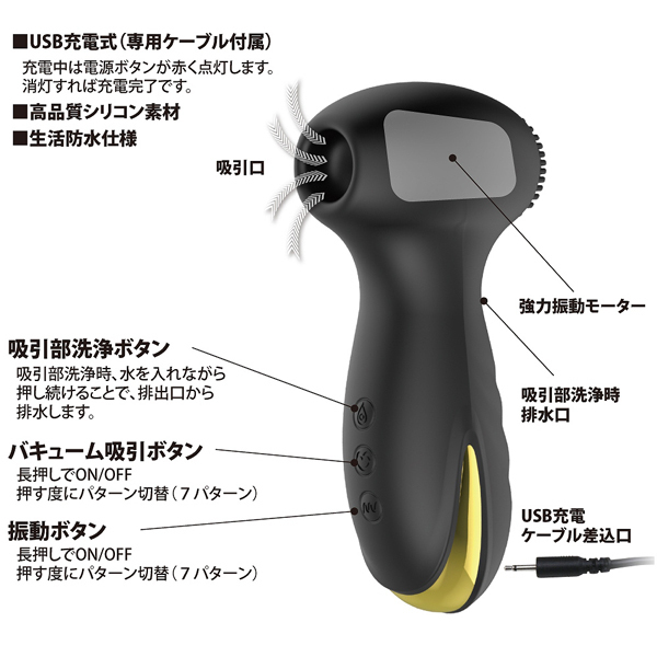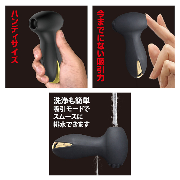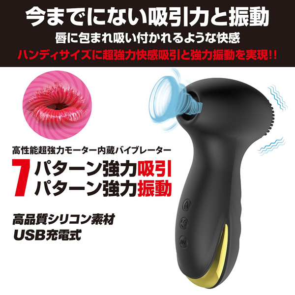 | ハンディサイズなのに超強力な吸引バイブ。 7種の吸引力と7種の振動パターンでクリトリスを吸い上げパワフル振動!唇に包まれ吸われるような快感が貴女を絶頂へと導きます♪吸引口の後ろ側にはモーターを内臓、表面の細かな突起で乳首や好きな箇所をピンポイントに刺激して楽しむのも有り!また、使用後の衛生面が心配という方も安心な生活防水付きで、吸引口から水を入れて洗浄することも可能。 排水機能もしっかり備わっており、使った後はお手入れして清潔に保管していただけます♪USB充電式(専用コード付)、高品質なシリコン素材を使用しています。 |
