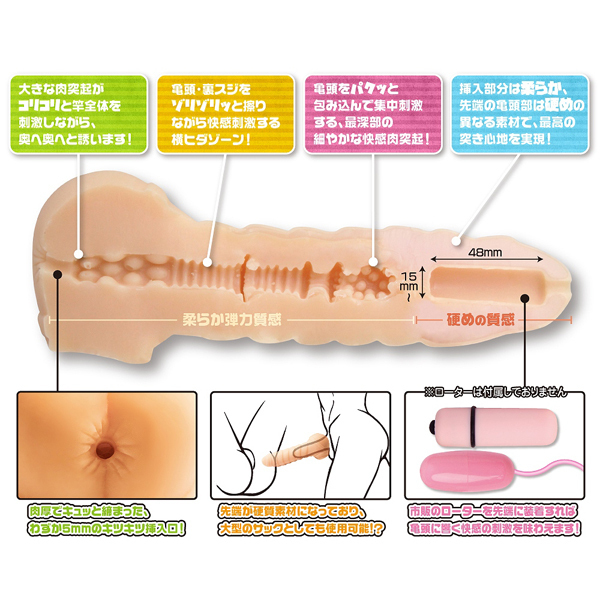 | キュッと締まった菊門とリアルなペニスの形がエロさ際立つ♪モチっとした伸縮性をもつエラストマー素材を使用したコチラは、サックとしても使えるよう先端が硬質素材仕様となった特殊な非貫通型ホール。 お尻の穴の先はサオをゴリっと刺激するイボゾーンや、亀頭と裏筋にゾリゾリ刺激を加える横ヒダ空間、亀頭を咥え込み集中刺激する肉突起ゾーンを配置し、緩やかな快感でフィニッシュまで導きます♪先端部にはローターを装着することも出来るため、市販のローターをプラスして亀頭へ快感振動を与えることも可能!1つで多様な楽しみ方をしていただけるホールとなっています♪ローション付属 |