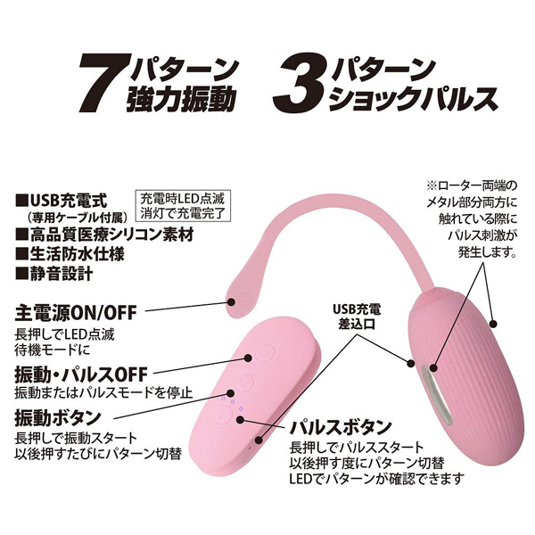 | 振動&低周波パルス機能 / USB充電式。 未知への扉が開かれる…超強力振動と電撃低周波パルスの刺激が襲うリモコンローター!!電気刺激でビクンビクン収縮させつつ、強烈な振動で未知のアクメへ誘います。 もう振動だけじゃ満足出来ない、クセになる刺激を求める方に長く愛されてきた低周波シリーズ●3パターンショックパルス●7パターン強力振動●高品質シリコン素材●生活防水●静音設計●専用USB充電コード付属、充電時間:60分、連続稼働時間:40分。 |