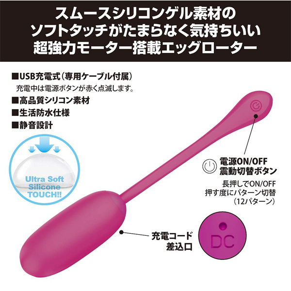 | 側はサラッとしたシリコン、内側は柔らかなスムースシリコンゲル素材を使用した、ソフトタッチがたまらなく気持ちいい超強力モーター搭載エッグローター!柔らかな優しい挿入感、しかし震動は超強力でGスポットへと快感が響き渡ります。 挿入したままテールの先端にあるボタンで操作が可能。 ●高品質シリコン+スムースシリコンゲル素材●12パターン強力震動●静音設計●生活防水●専用USB充電コード付属 |