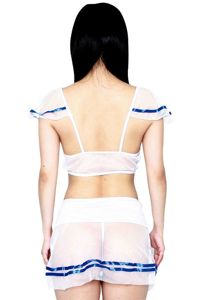 | セーラー服とランジェリーが組み合わさったような透け感たっぷりのコスプレ衣装♪シースルー生地に鮮やかな青いラインを2本、胸元をふんわりとした白のリボンで装飾した可愛らしいデザインとなっています♪ |