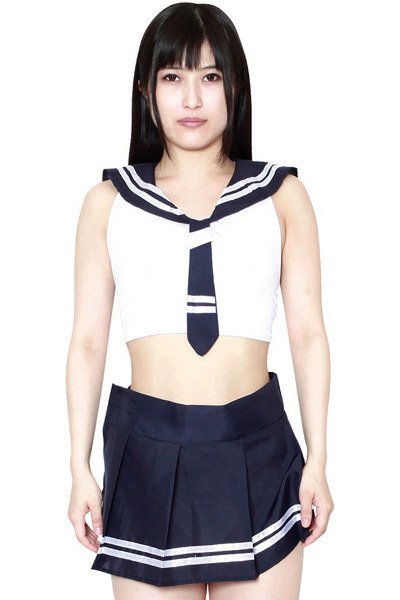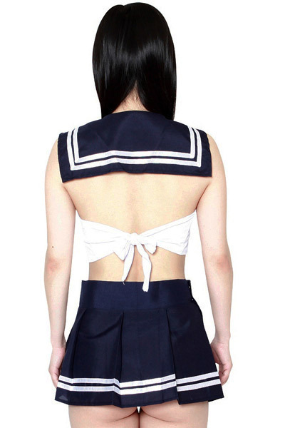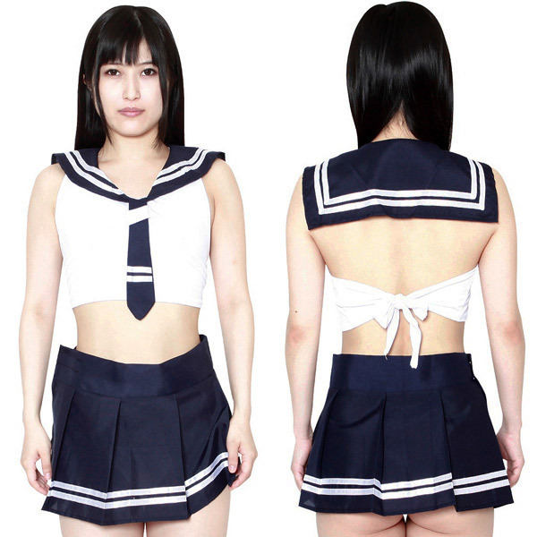 | ネイビー×白の定番セーラー服を色気たっぷりに仕上げた、後ろ結びミニ丈トップスとマイクロ丈プリーツスカートの2点セット!セーラー服特有の大きな襟と、ボックスプリーツスカート、そして紺色のネクタイには太目の白ラインを2本施しています。 全体的に露出度高めのデザインはカップルや夫婦でのお楽しみにピッタリです♪ |