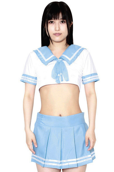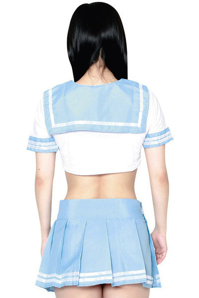 | パステルブルーの淡い色味が可愛いミニ丈セーラー服コスプレ。 短めトップスから見えるおヘソや背中にドキッとしちゃう!ストレッチトップス+ミニスカート+Tバックがついた3点セットです♪ |