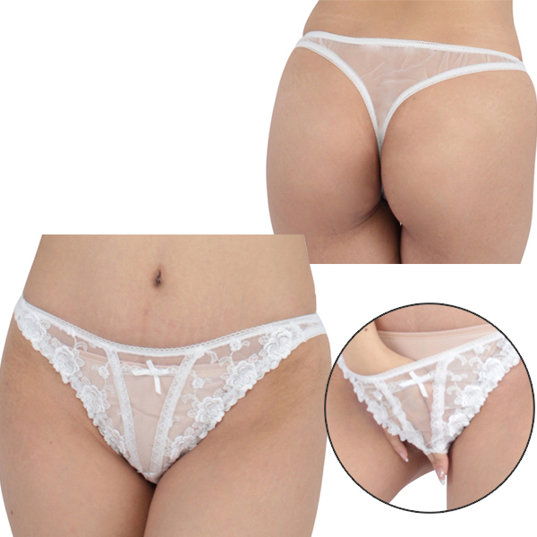 | 透け感のあるシースルー生地に、花の刺繍やスカラップレースなどあしらいエレガントに仕上げた可愛らしい日本製オープンランジェリー(ホワイト)。 お尻の丸みが際立つTバックで、クロッチ部分は着衣プレイに最適なオープン仕様となっています♪ |