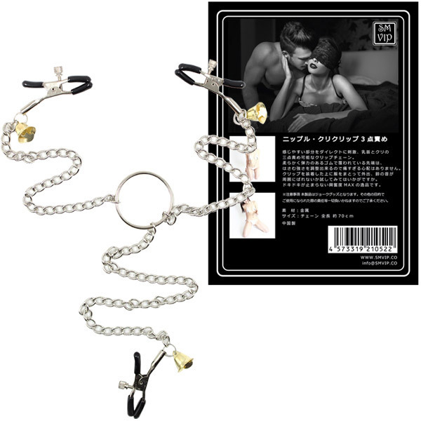 | 感じやすい部分をダイレクトに刺激!SMグッズで人気のブランドSMVIPから3点責めが出来るSMグッズが新登場。 こちらは両乳首とクリの3点を同時にクリップで挟み込んで刺激を与えるグッズで、SMチックなイタ気持ちよさでM心を高めてくれるでしょう♪チェーン長は70cmあるので女性の身体ならば両乳首とクリの3点責めにジャストなサイズと言えるでしょう!それぞれ先端にはワニ口のクリップが付いており、ゴム製のカバーで覆われているため跡が残りづらく、挟む強弱も調整出来ます。 また、クリップには鈴がついているので、鈴の音が周囲にばれないか試してみてはいかがでしょうか! |