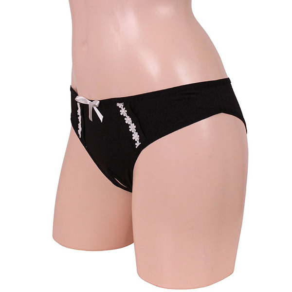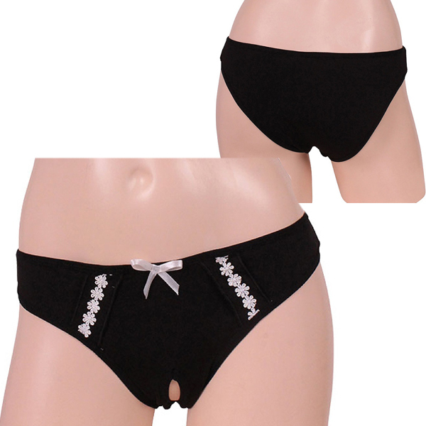 | ピュアそうに見えて実は小悪魔!アダルトな仕掛けにドキッとする穴あき仕様のフルバック♪クロッチ部分に切れ込みが入った黒のフルバックに、リボンと小ぶりな花の刺繍を飾り可愛さをプラスした小悪魔女性のためのフルバックです。 |