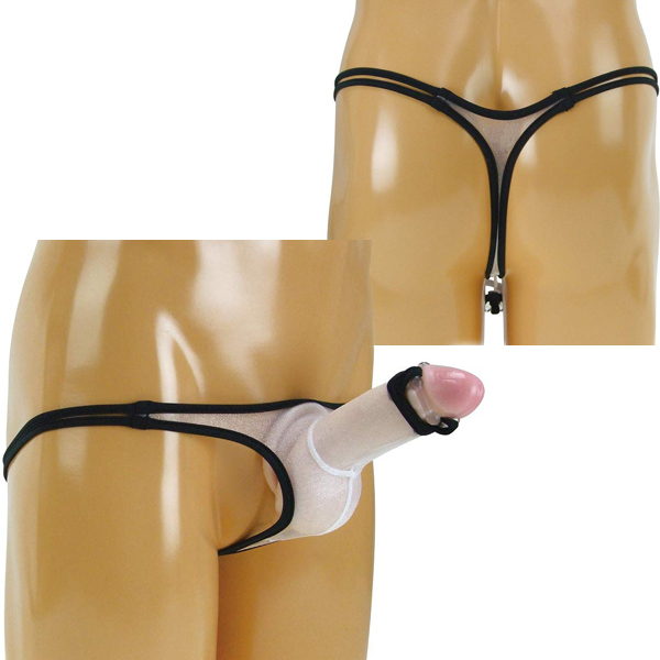| 極薄のメッシュ地を黒パイピングで縁取った日本製Tバック(白)。 フィット感抜群なTバックは亀頭を露出させるセクシーデザイン!男性器を締め付け刺激するリング付き。 |