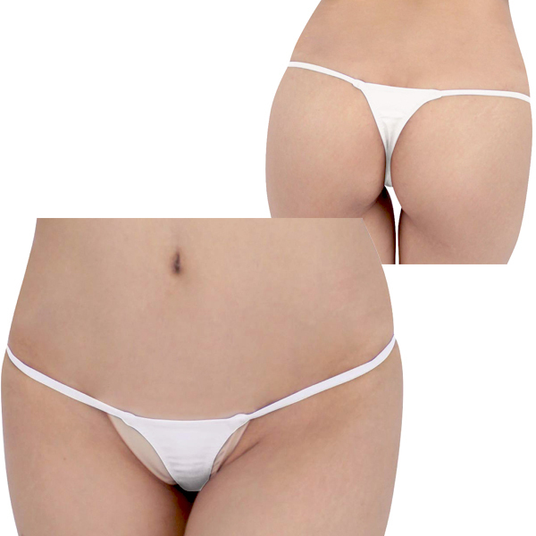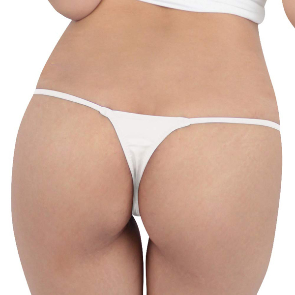 極小サイズの光沢生地で大胆に攻める日本製Tバック(白)。