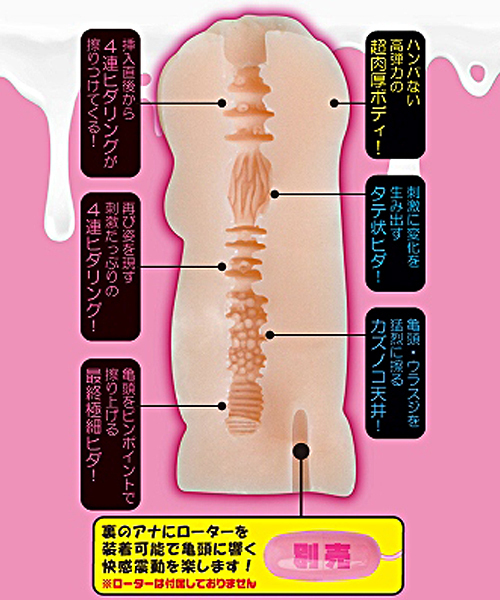 | ヒダとイボが亀頭・裏筋を締め付け、擦り、撫でる、トレーニングで引き締まった腹筋女子のアソコ。 ハンパない高弾力の超肉厚ボディで挿入直後から4連ヒダリングが擦り付けてくる!刺激に変化を生み出すタテ状ヒダに、亀頭・ウラスジを猛烈に擦るカズノコ天井と亀頭をピンポイントで擦り上げる最終極細ヒダ●ローターポケット付きでローターを装着して楽しめる●ローション付 |