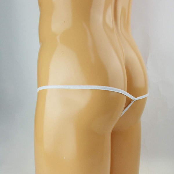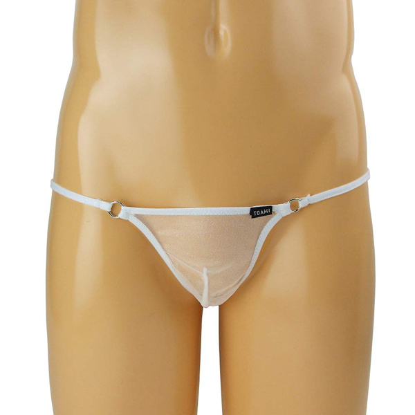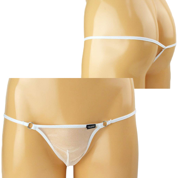 | スケスケ感が大胆過激な日本製のメンズ用セクシーTバック(白)。 肌が透けて見える通気性抜群な極薄生地と腰の細紐を丸型のゴールドリングでジョイント!夏などの暑く蒸れやすい時期にうってつけの一枚。 |