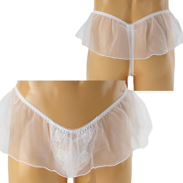 | 可愛いに憧れる男性に、レース刺繍が美しいスカート一体型のメンズ用Tバック(白)。 極薄のレース生地が動くたびにユラリと揺れる♪美しく、そしてエロティックな男性用のセクシーTバック。 縫製の丁寧な日本製 |