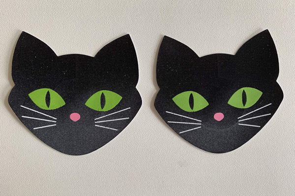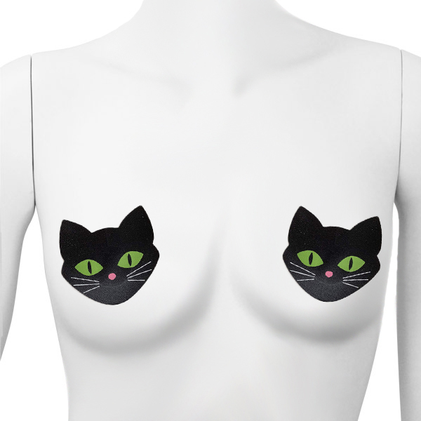 | 猫の目が暗闇で妖しく光る!蓄光仕様の黒猫ニップレス(2枚1セット)。 ハロウィンやホラーイベントに最適♪乳首に触れる裏面中央部分は肌保護のため粘着しない素材を使用しています。 |