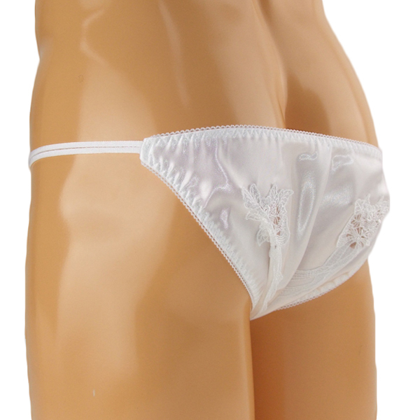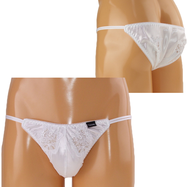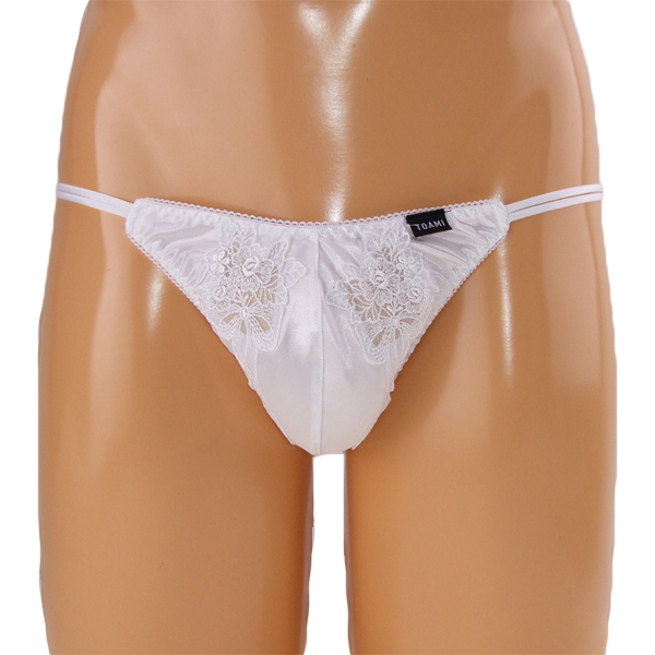 | 上品な光沢と華やかな花柄レースが下半身を美しく飾る♪伸縮性抜群のストレッチ生地を使用した日本製フルバック(白)。 前後の花柄刺繍からうっすら見える素肌がセクシーな一枚!女装下着用にぜひ♪ |