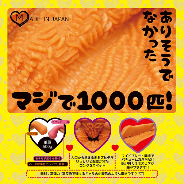 | 千匹のミミズのヒダが絡み付き刺激するモチっと張りのある高弾力素材の非貫通オナホ(日本製)。 小麦色に焼けた黒ギャルをイメージした弾力のある約500gの肉厚ボディが、ぐにゅぐにゅと絡み吸い付き責め立てる!ミミズ1000匹の比喩ではないリアルな快感をぜひお試しあれ♪ローション付属 |
