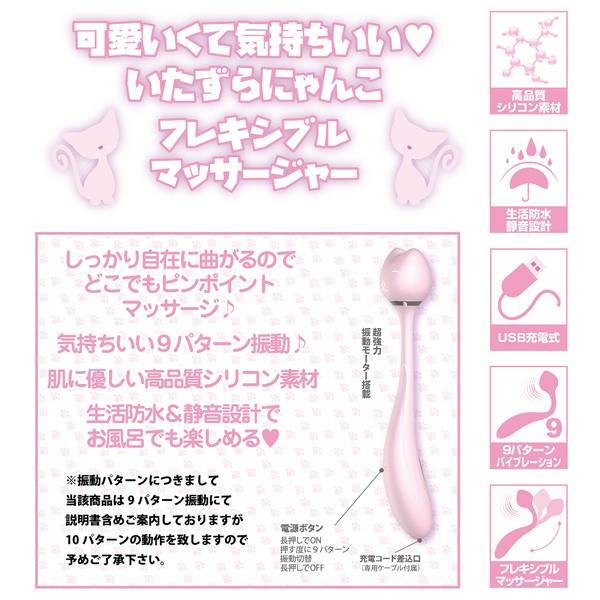 | 自由に曲がるフレキシブルボディで欲しい所をピンポイントに刺激♪猫型ヘッドの可愛いUSB充電式ローター(ピンク)。 肌に優しい高品質シリコン素材を採用!生活防水&静音設計なので響きやすいお風呂場でも楽しく使える♪10種類の振動パターンを搭載した強力モーター内蔵の可愛いローターです。 自分へのご褒美、パートナーへのプレゼントに♪ |