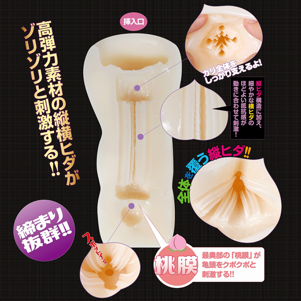 | 前作「桃ずきんちゃんdeもんもん!」にハリのある高弾力素材を使用した日本製の非貫通オナホが新登場。 非貫通ならではのバキューム感と硬め素材の締め付けが、内壁に張り巡らされた縦横ヒダをしっかりアピール!最奥には亀頭をクポクポとはめ込むような「桃膜」が配置され、全方向から貴男のムスコを激しく責める!ローション付属 |