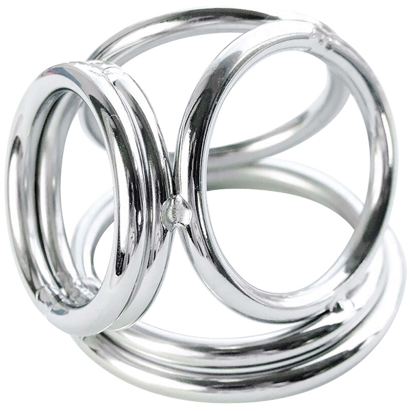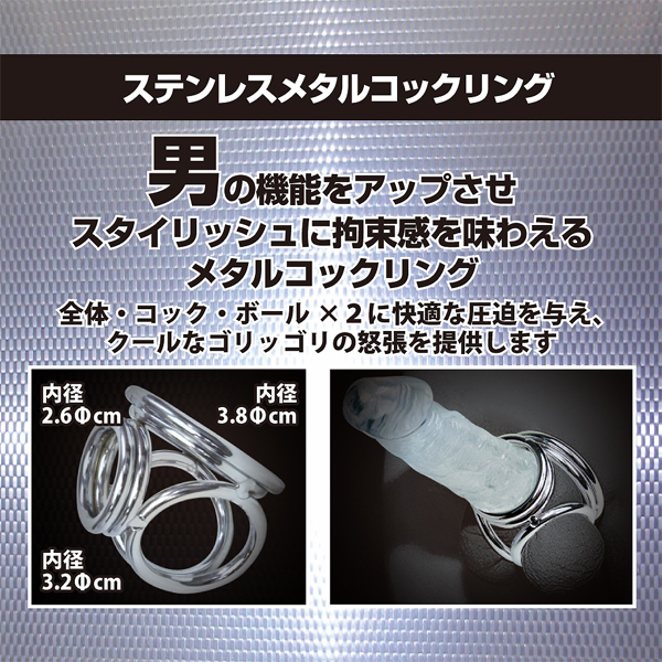 男性器の根元3箇所を程よく圧迫!男性補助をするだけでなく拘束感も味わえるメタル製のコックリング。