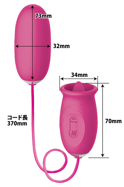 パッケージ:20.4×9.7×5.7cm 舌ローター(7.0×3.4cm)・振動ローター(7.3×3.2cm)・コード長37.0cm USB充電式 |