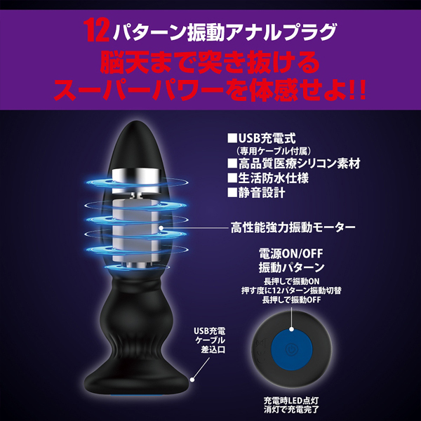 | 脳天貫くような快感刺激!高性能モーターを内蔵した凹凸形状の電動アナルプラグ。 肛門に装着してスイッチON!電源のオンオフから12種類の豊富な振動パターンまで、1つのボタンを押すだけの簡単操作で楽しめる♪素材には肌に優しく滑らかな医療用シリコンを採用!安心安全のUSB充電式アナルプラグです。 生活防水&静音設計 |