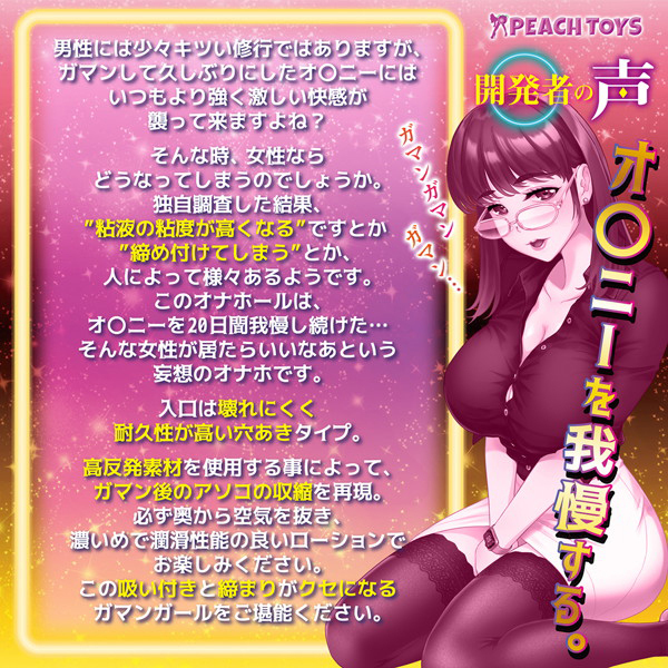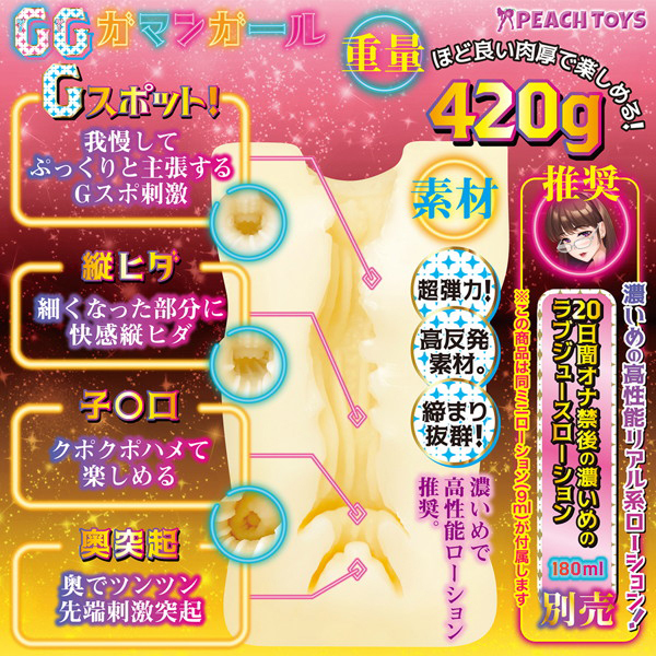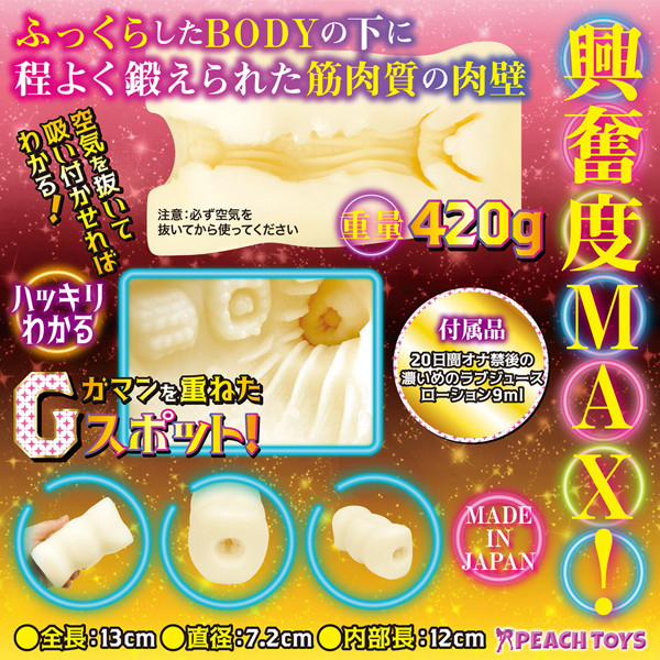 | 我慢を重ねた女性の膣内を再現した420gの肉厚オナホ。 高弾力でハリがあり締まりも抜群!耐久性が高いので奥までしっかりお楽しみ頂けます。 ぷくっと膨らむGスポや先っぽを咥え込む子宮口、そして先端をつつく奥突起で貴方の精を搾り取る!高粘度ローション付属。 本品と合わせて「20日間オナ禁後の濃いめのラブジュースローション(b30081)」も是非どうぞ♪日本製、非貫通 |