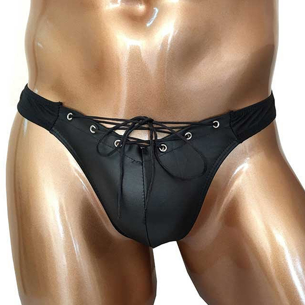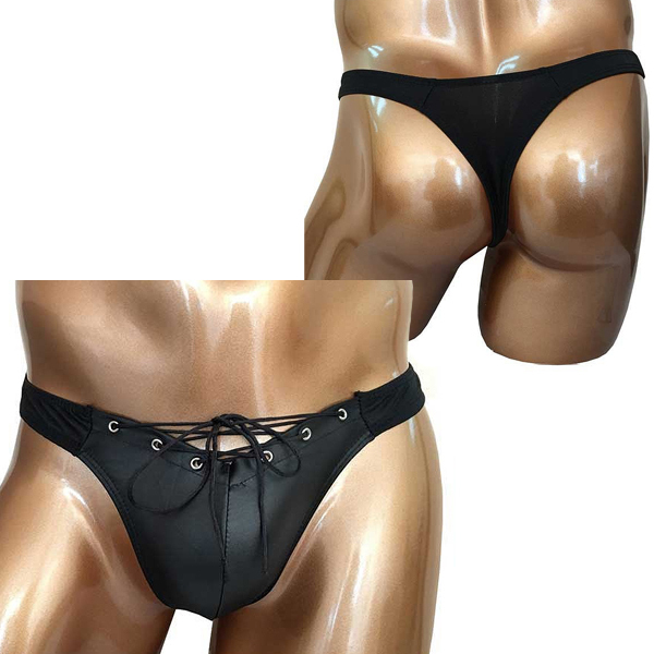 | マットな光沢感が魅惑的!立体縫製で包み込むお洒落な男性用Tバック。 ハトメ金具に紐を通しレースアップしたスタイリッシュなデザイン♪バックはタンガデザインで、引き締まったお尻をアピールします。 ブラックカラー、フリーサイズ |