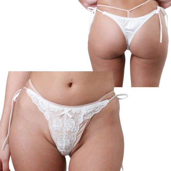 > 光沢生地にレース付き脇ヒモTバック Lサイズ ホワイト